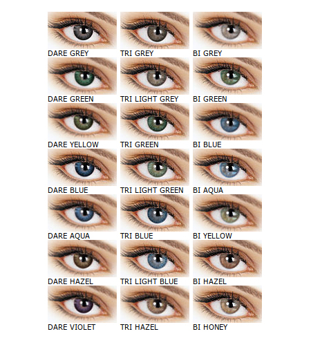 | Χρώμα Φακών Επαφής | Bi Aqua, Bi Blue, Bi Green, Bi Grey, Bi Hazel, Bi Honey, Bi Yellow, Dare Aqua, Dare Blue, Dare Green, Dare Grey, Dare Hazel, Dare Violet, Dare Yellow, Tri Blue, Tri Green, Tri Grey, Tri Hazel, Tri Light Blue, Tri Light Green, Tri Light Grey |